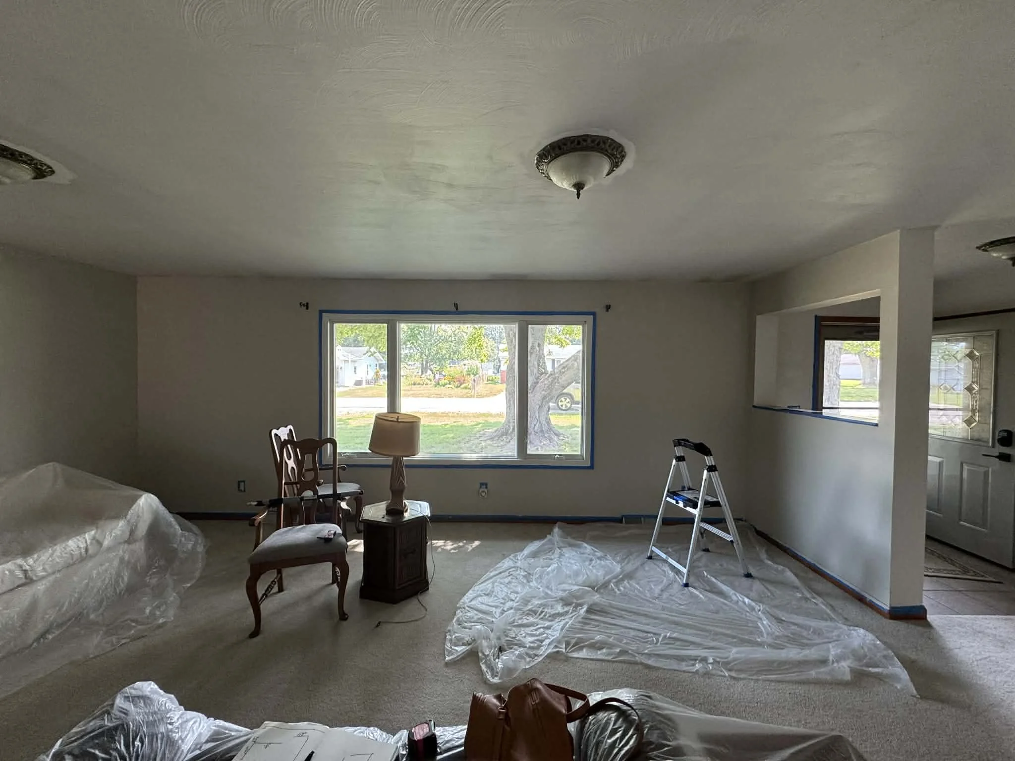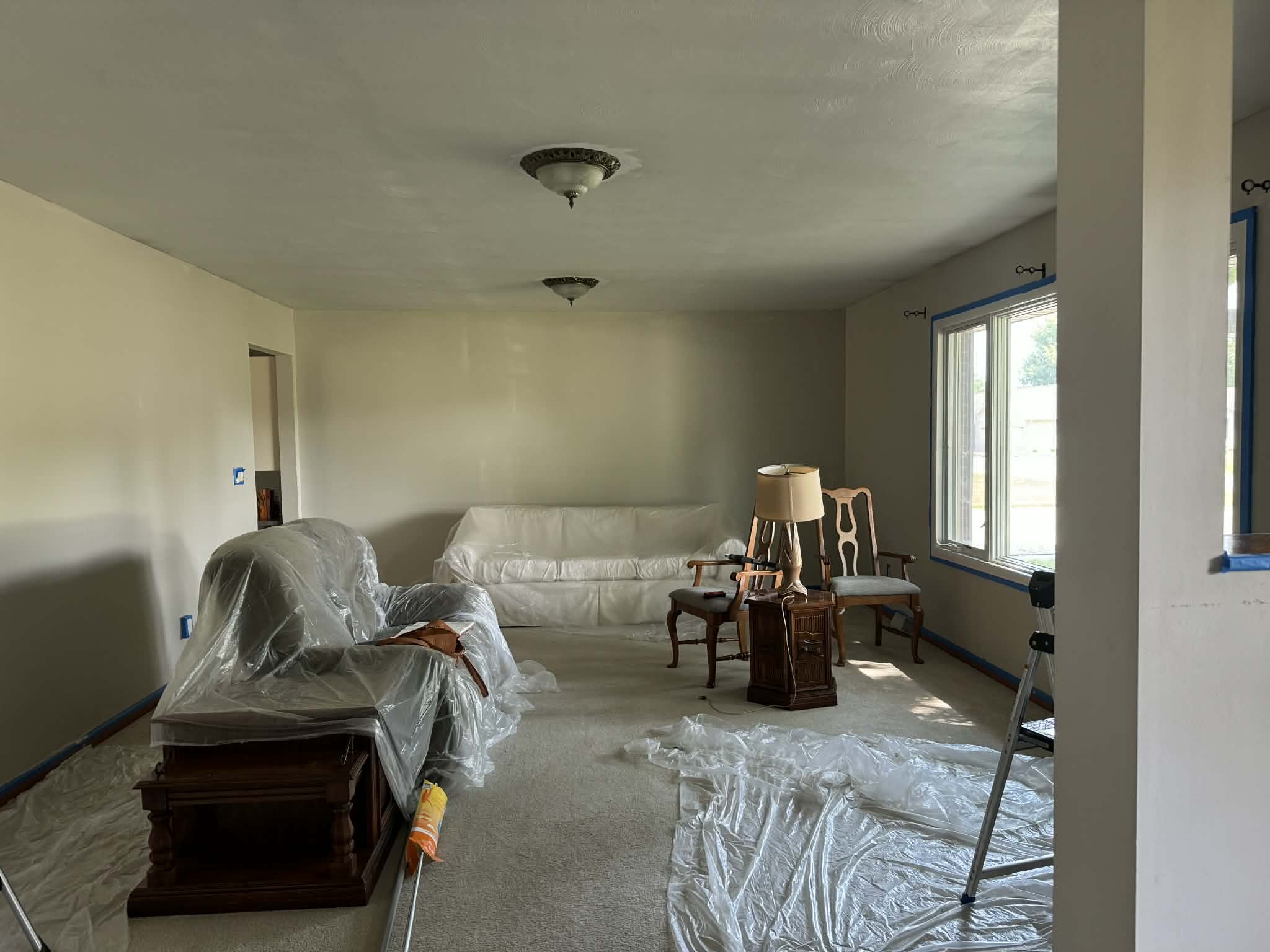 This family room is a long, shotgun-style space—beautiful, but a bit tricky to lay out. I knew the room needed to be visually divided with furniture to create a more functional flow. I also didn’t want the TV placed in a corner or directly across from the large window, which would cause glare, so the far wall became the natural choice. (The two paintings leaning against the wall is where the TV will go.)