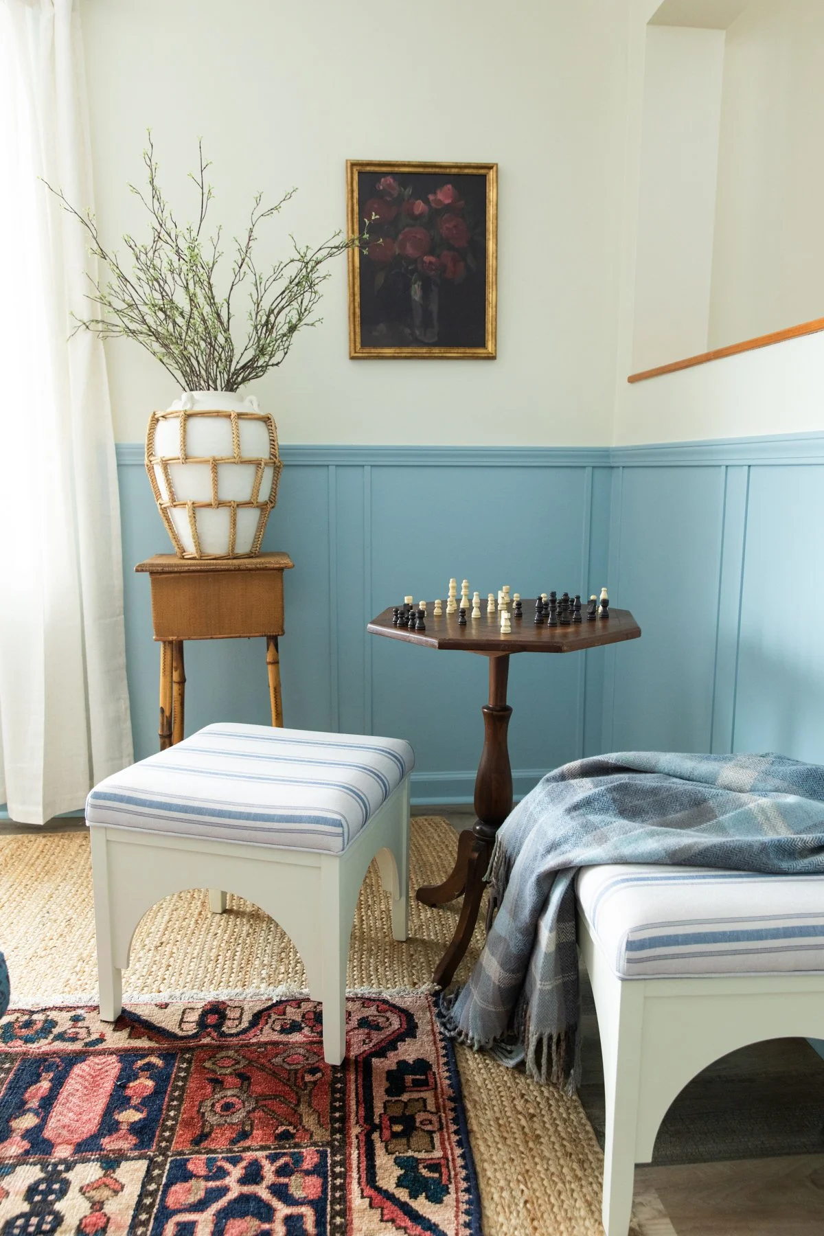 One of my favorite details is this little corner with the antique chess table—it’s such a sweet, quiet moment within the room.
