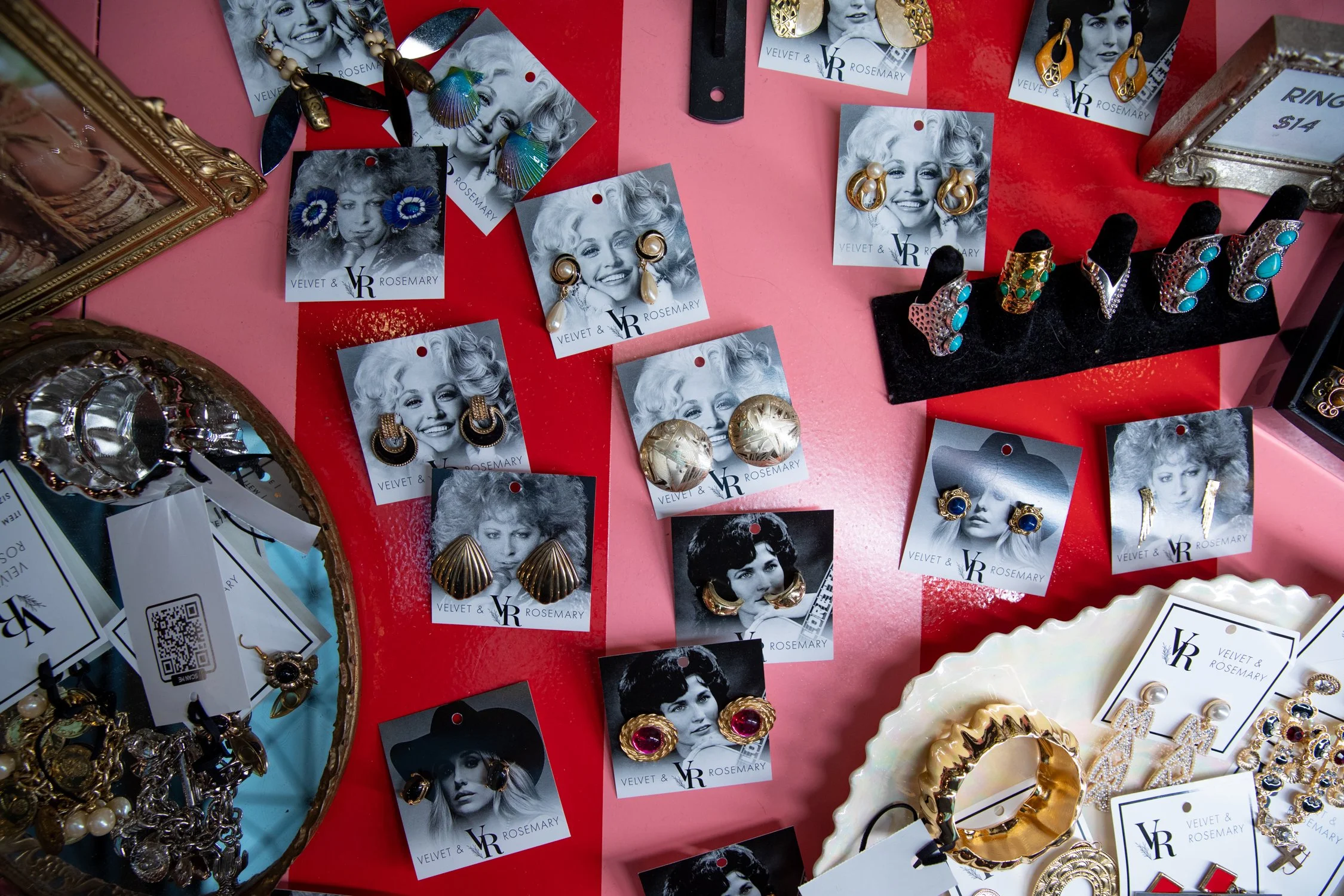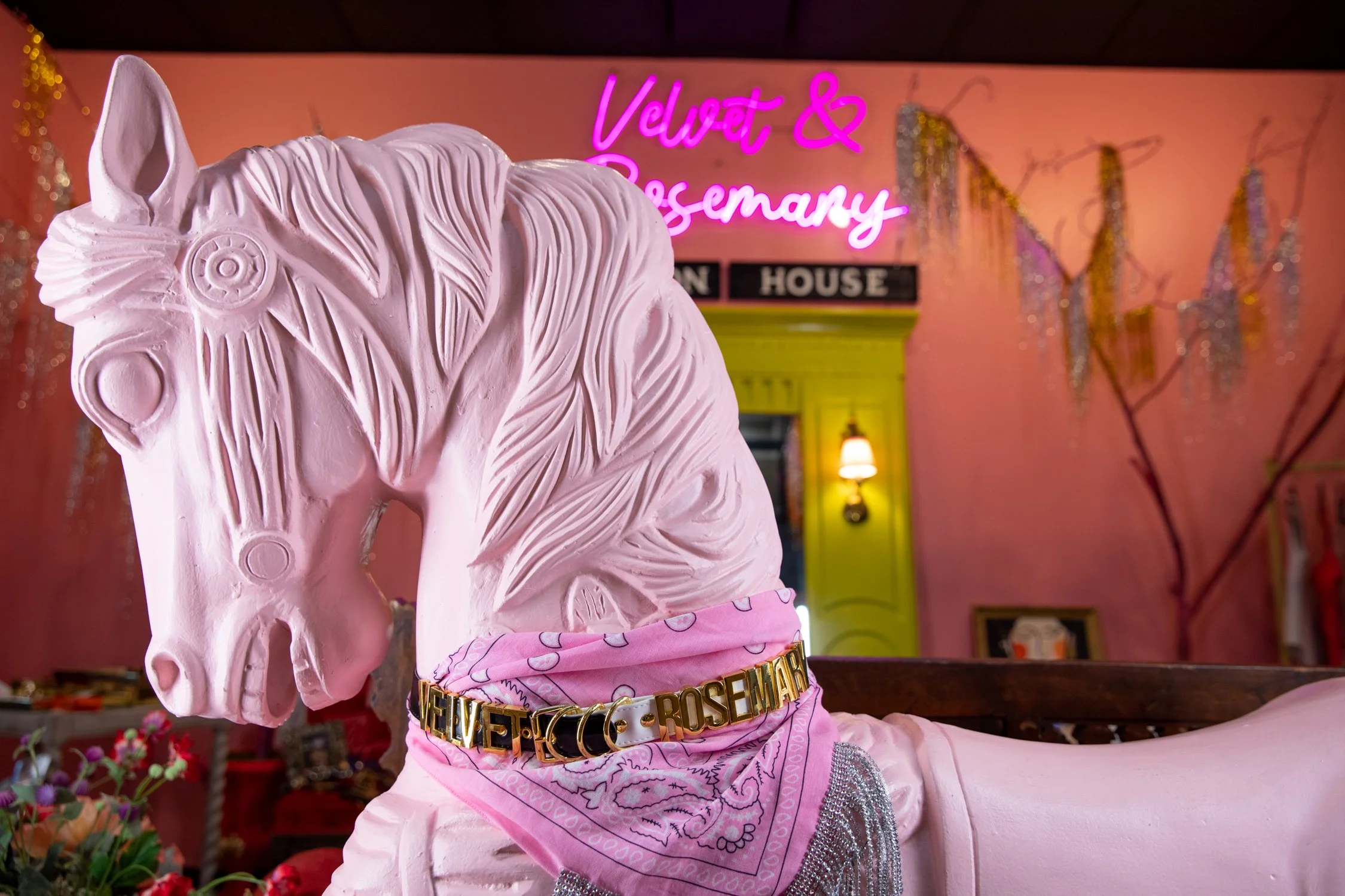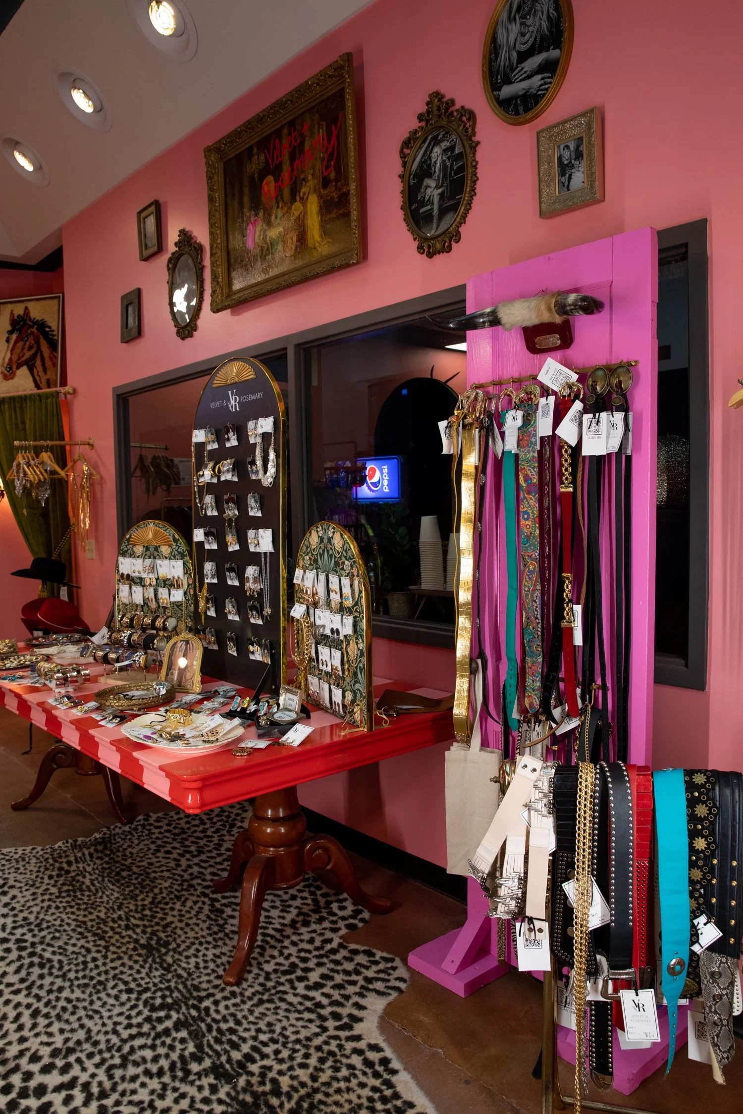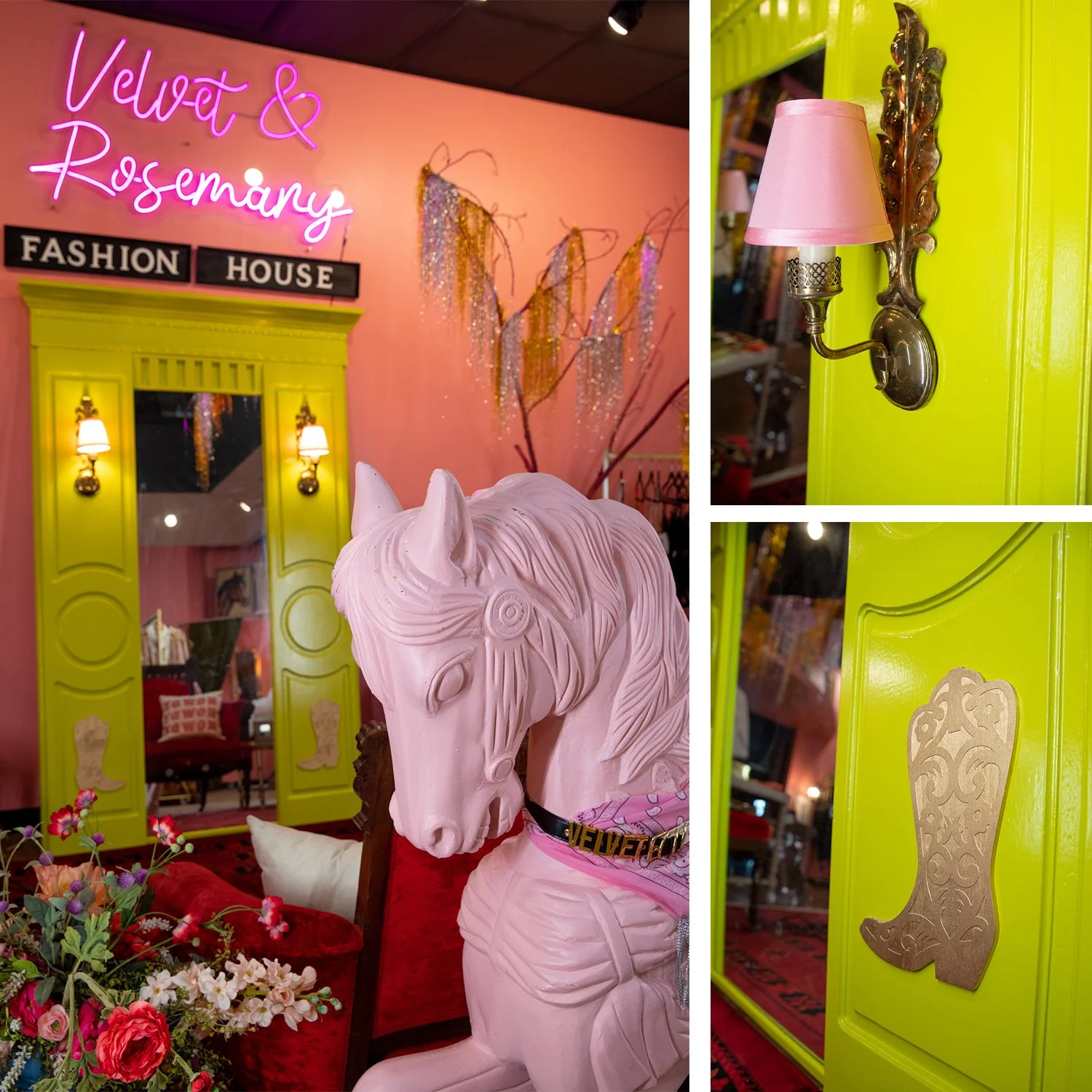 It’s all the little details and well, big details like our big pink pony that adds up to create a super fun space! If you haven’t been in to check it out yet, please do! We have a mix of new, vintage and preloved items with lots of accessories. There are two fitting rooms with velvet drapes for you to try on all the unique finds. Be sure to follow Velvet & Rosemary on Instagram. Tag us in your fits— we always love to see how you style your purchases!